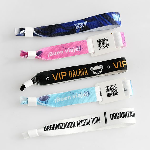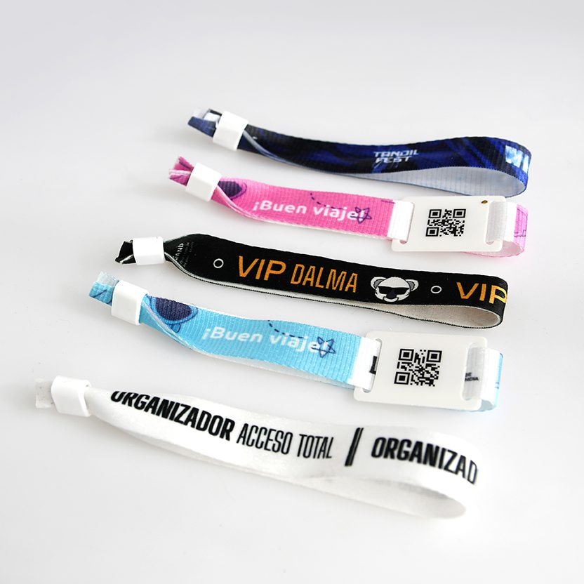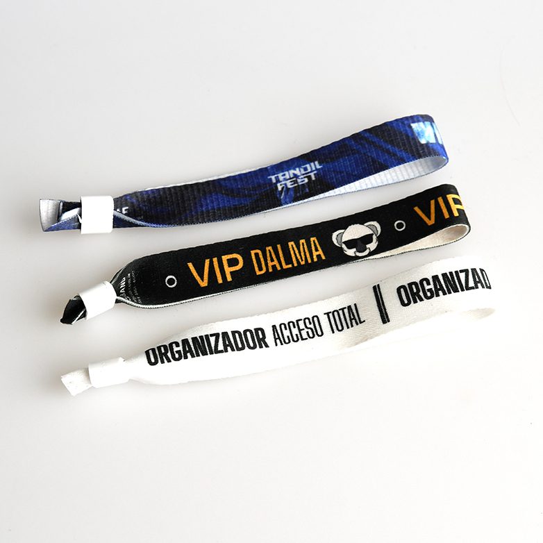 Las Pulseras de Tela, sublimadas a todo color, con broche de seguridad, son intransferibles. Ideales para el control y la identificación de personas en accesos a eventos. No destiñen, no manchan; no se desgarran, resisten al tiempo y al agua. Permiten impresión personalizada full color, para una rápida identificación. Ofrece diversas opciones de como logo, texto o código QR.